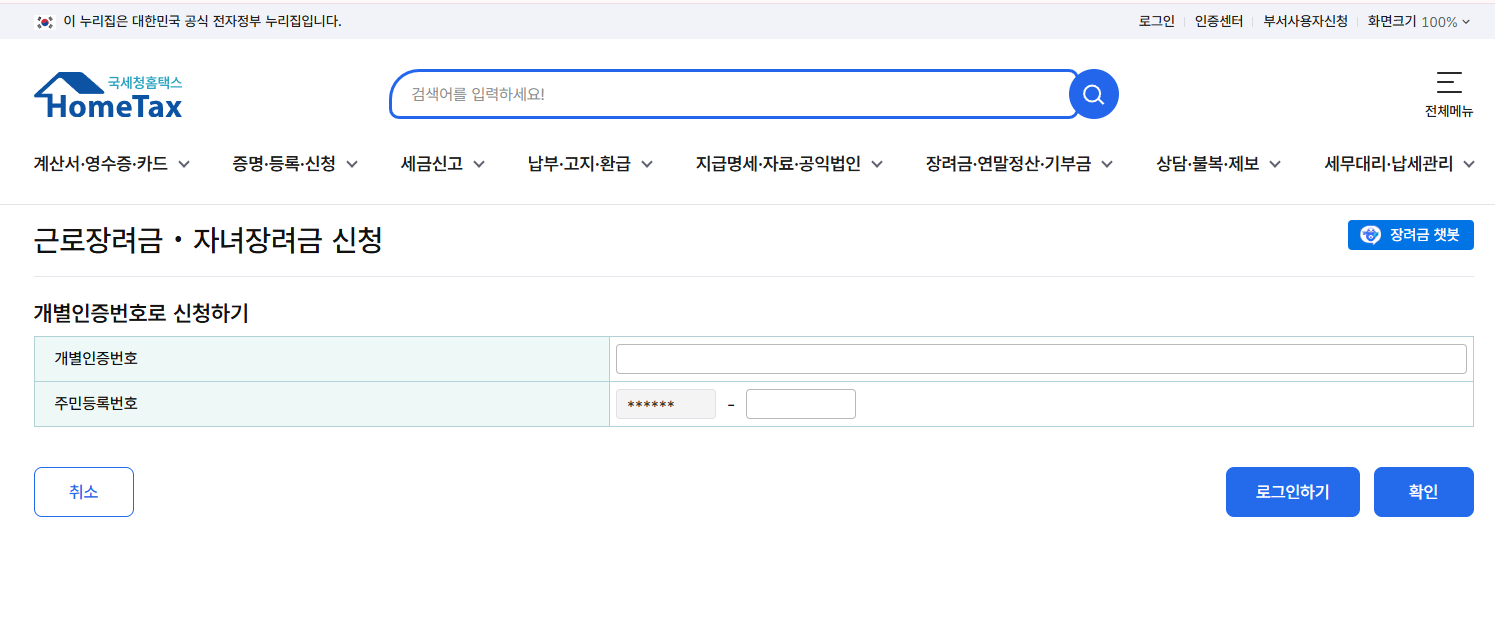 - 홈택스 접속 → 로그인 → 정려금·연말정산·전자기부금 → 근로장려금(정기/반기) → 직접입력 신청